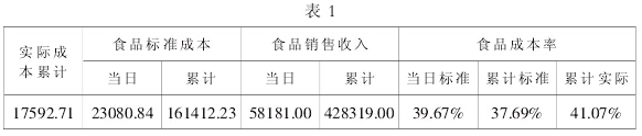第三,根据每日和每月的销售报表计算标准成本的控制情况。通过对去除除食品原料成本标准成本与实际消耗成本的比较好的安置一个小枕头安置一个小枕头较比较好的安置一个小枕头安置一个小枕头较,可以找出餐饮成本加工管理中存在的问题。标准成本与实际成本的比较好的安置一个小枕头安置一个小枕头较比较好的安置一个小枕头安置一个小枕头较分析是通过“每日餐饮成本报表”完成的。如某酒店每日成本报表中餐食品部分见表1。